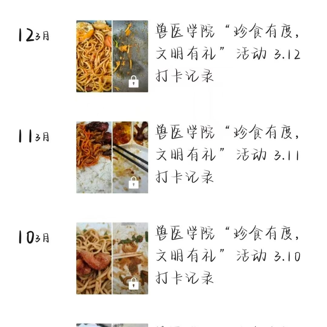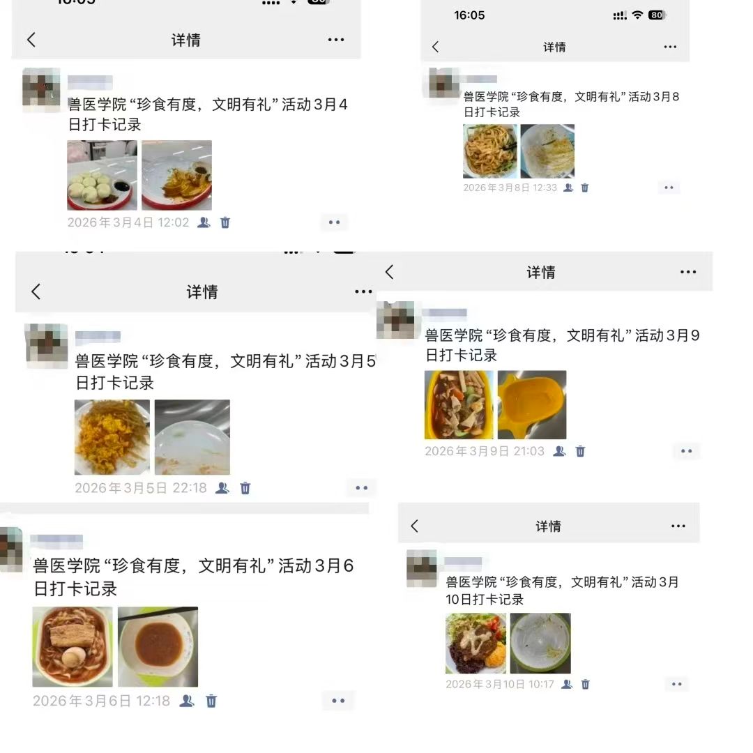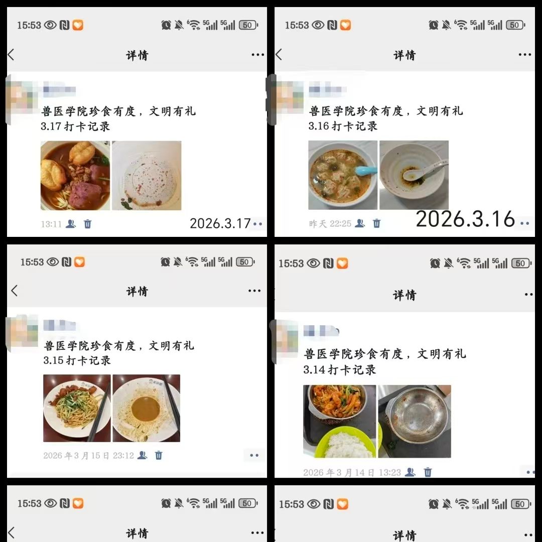 活动期间,同学们积极响应、踊跃参与,用实际行动践行节约粮食、反对浪费的优良传统。有的同学坚持每餐光盘,并拍照打卡记录;有的同学主动宣传节约理念,带动身边人共同践行光盘行动。大家以多样形式投身本次活动,充分展现了兽医学子勤俭节约、文明有礼的良好精神风貌。