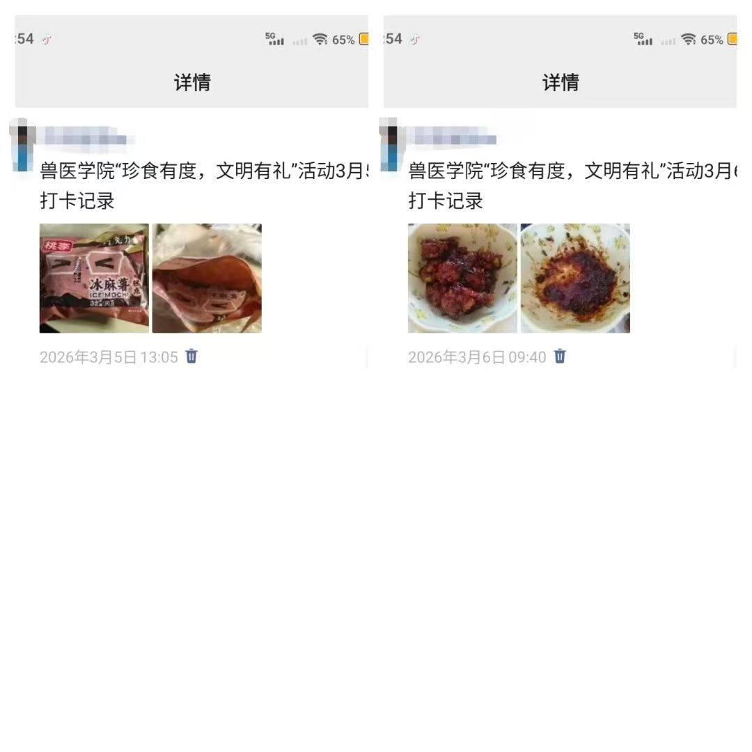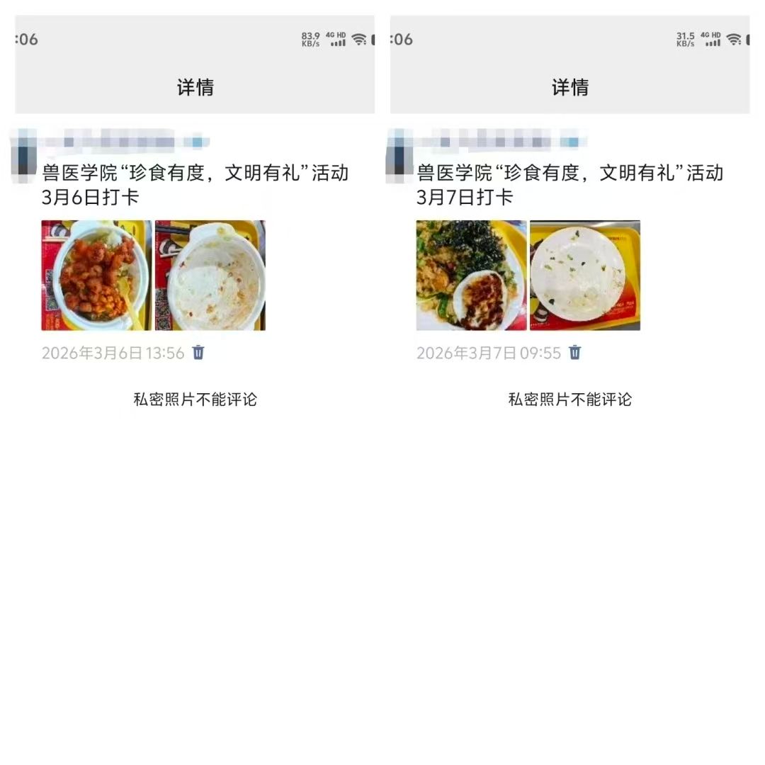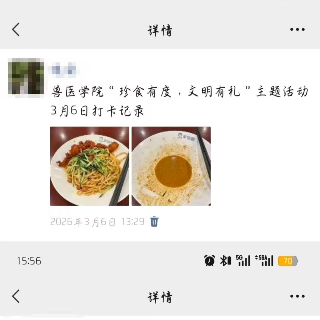 活动期间,同学们积极响应、踊跃参与,用实际行动践行节约粮食、反对浪费的优良传统。有的同学坚持每餐光盘,并拍照打卡记录;有的同学主动宣传节约理念,带动身边人共同践行光盘行动。大家以多样形式投身本次活动,充分展现了兽医学子勤俭节约、文明有礼的良好精神风貌。
