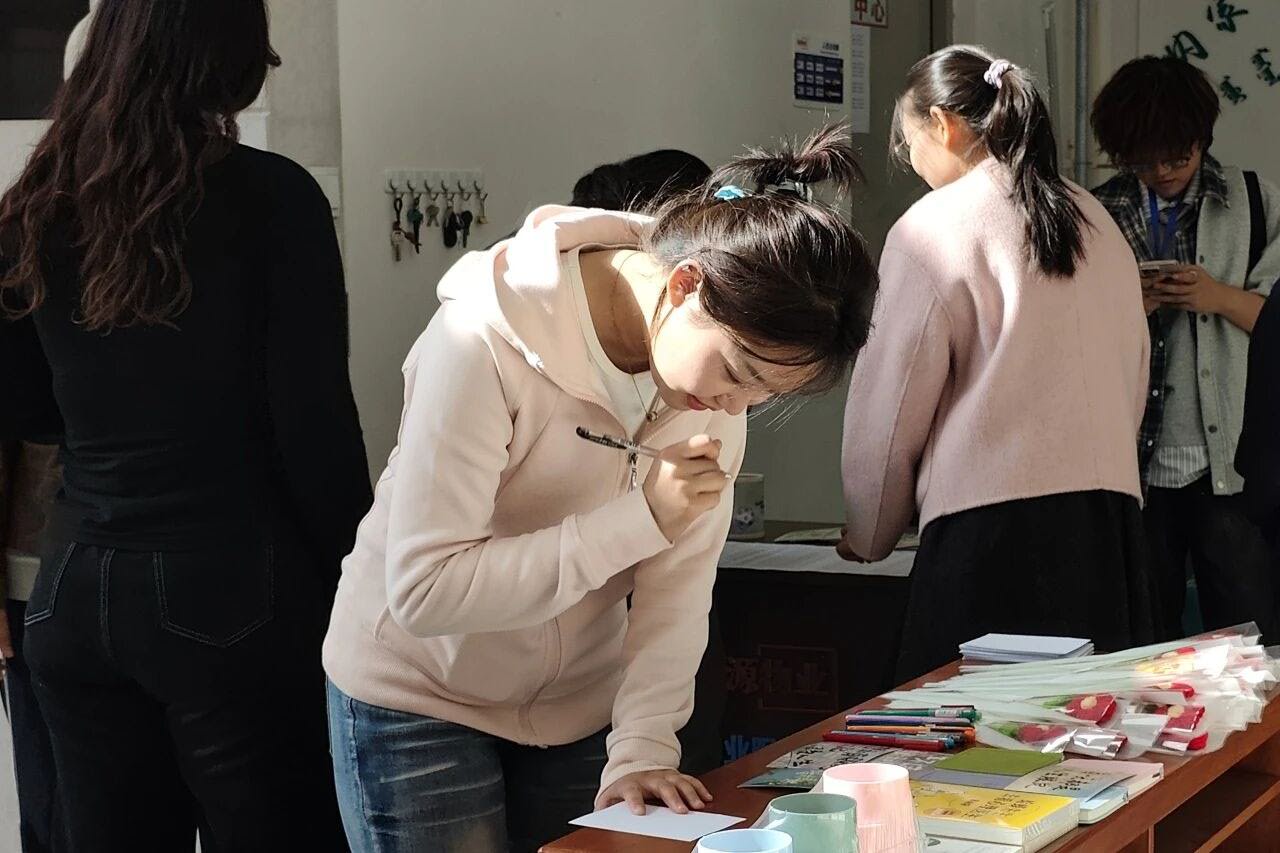本次活动以“把烦恼丢进垃圾箱,把温柔与美好带回家”为主题,设置了匿名情绪交换环节。同学们可将烦恼写在便签上投入“情绪垃圾桶”,同时随机抽取陌生人的祝福卡片,在互动中释放压力、收获善意。学院为参与者提供了抽奖机会,奖品包括书籍《蛤蟆先生去看心理医生》、多功能旋转笔筒、每日计划本及手工钩织小红花等。