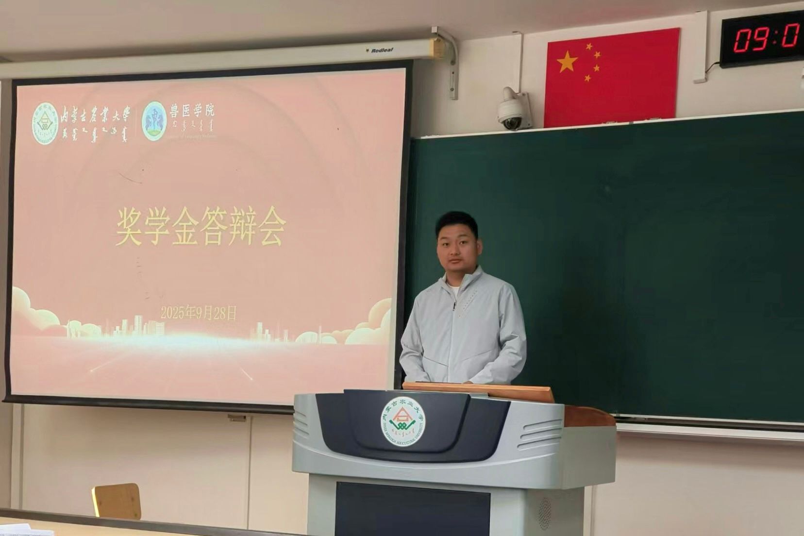 为挖掘奖学金的激励作用,将竞争与展示有机结合,提升评审过程的育人成效,9月28日上午,经前期差额评选确定候选人后,兽医学院组织申报2025年国家奖学金、自治区奖学金和乌兰夫奖学金的同学们开展公开答辩。兽医学院党委副书记王阿荣,辅导员郝凌魁担任评委。