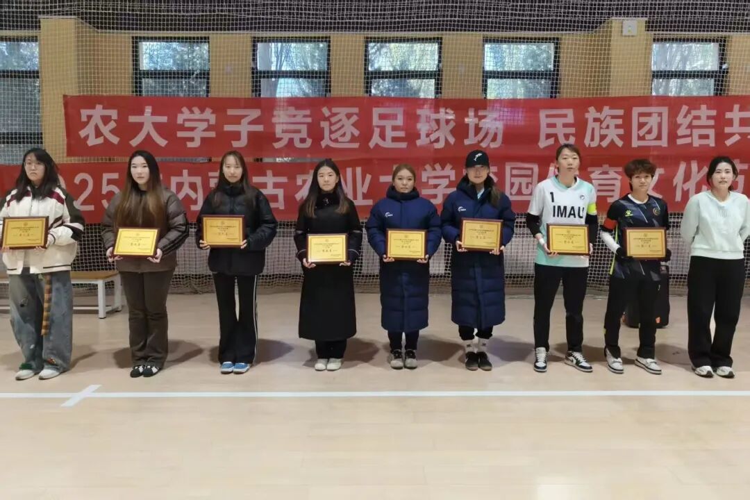 比赛过程中,兽医学院运动员技术扎实,跑动积极,在抢断、传球与射门等环节均表现出良好的竞技状态。面对对手的严密防守,队员们沉着应对,及时调整战术,积极争取比赛主动权。场边观众的加油助威声此起彼伏,充分展现了校园体育的良好氛围。致敬每一份热爱与坚守!优异的成绩离不开队员的刻苦训练和教练的悉心指导,是他们让赛场充满能量,让热爱绽放光芒!闭幕式上,樊玮老师宣布比赛成绩,内蒙古农业大学足球队女足教练塔娜和男足教练吕逸为获奖运动员颁奖。赛后,全体队员与教练合影留念,定格这段充满激情与友谊的绿茵记忆。