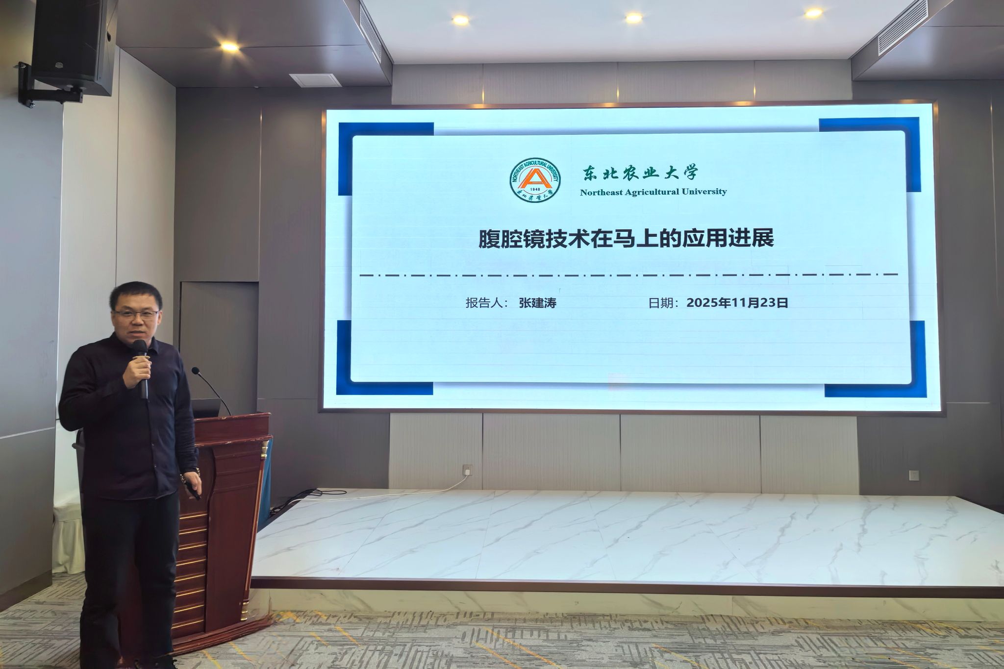 东北农业大学动物医学学院张建涛教授就腹腔镜技术在马匹上的应用进展进行讲述 兽医学院张雨 摄