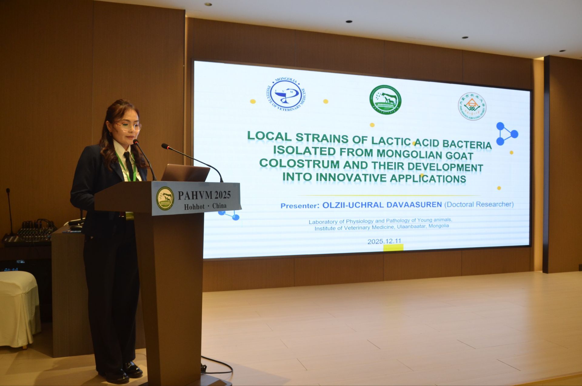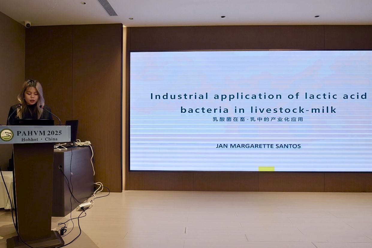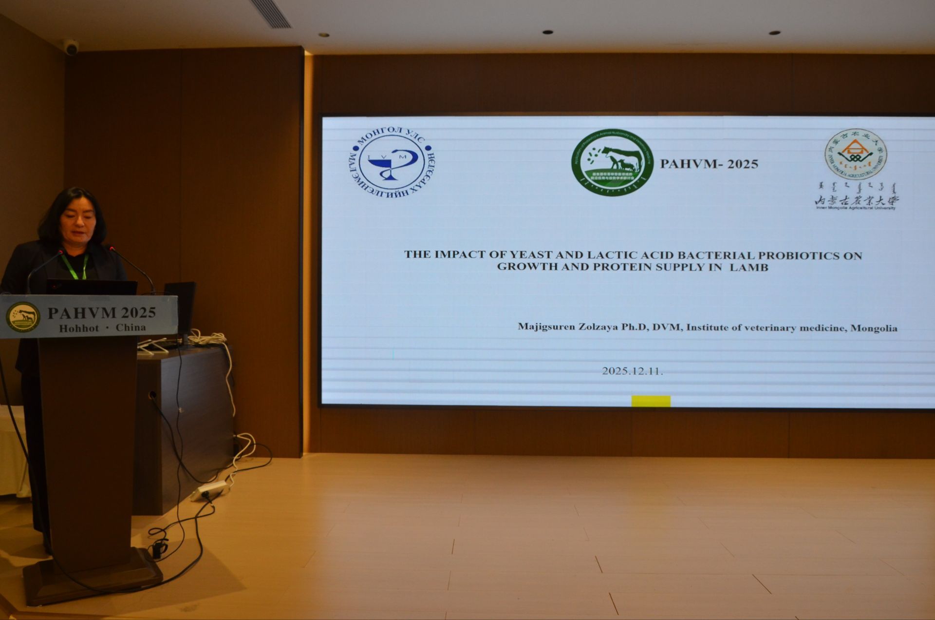 会议围绕动物益生菌研究与应用等前沿领域展开深入交流,Yuan Kun Lee阐述了家禽益生菌制剂的设计与应用;陈灰报告了YC和YP对蒙古羔羊生长性能及肠道健康的改善作用;王军军揭示了GOS与罗伊氏乳杆菌的协同增效机制;倪学勤介绍了地衣芽孢杆菌H2防治肉鸡坏死性肠炎的研究进展;姜延龙分享了新型侵入型植物乳杆菌载体的研发成果;Khorolgarav展示了内蒙古益生菌技术项目中筛选的优质乳酸菌株及其在奶牛养殖中的应用成效;Mohai Ud Din Raza探讨了辣木叶多糖对小鼠结肠炎的作用机制;Demberel Shirchin系统汇报了益生菌在兽医领域的应用;Majigsuren Zolzaya 研究了益生菌对羔羊生长及肉质的提升效果;Tsogtbaatar Lkhagvajav汇报了从蒙古绵羊瘤胃中分离的优良枯草芽孢杆菌菌株;Jan Margarette Santos介绍了乳酸菌产业化应用成果;Sindaye Daniel分析了发酵棕榈仁饼作为替代饲料的潜力;Khorolgarav分享了从蒙古山羊初乳中筛选的专利乳酸菌株;Sukhbat Banzragch汇报了反刍动物源丙酸杆菌的分离与特性;Tumenjar Bazarragchaa研究了复合益生菌对羔羊代谢的积极作用;Zaccheaus Pazamilala Akonyani比较了不同日粮对羔羊瘤胃菌群的影响;王帅报告了酵母多肽与干酪乳杆菌联用对大鼠运动性能的提升作用。会议最后由内蒙古农业大学兽医学院副院长包福祥致闭幕词。